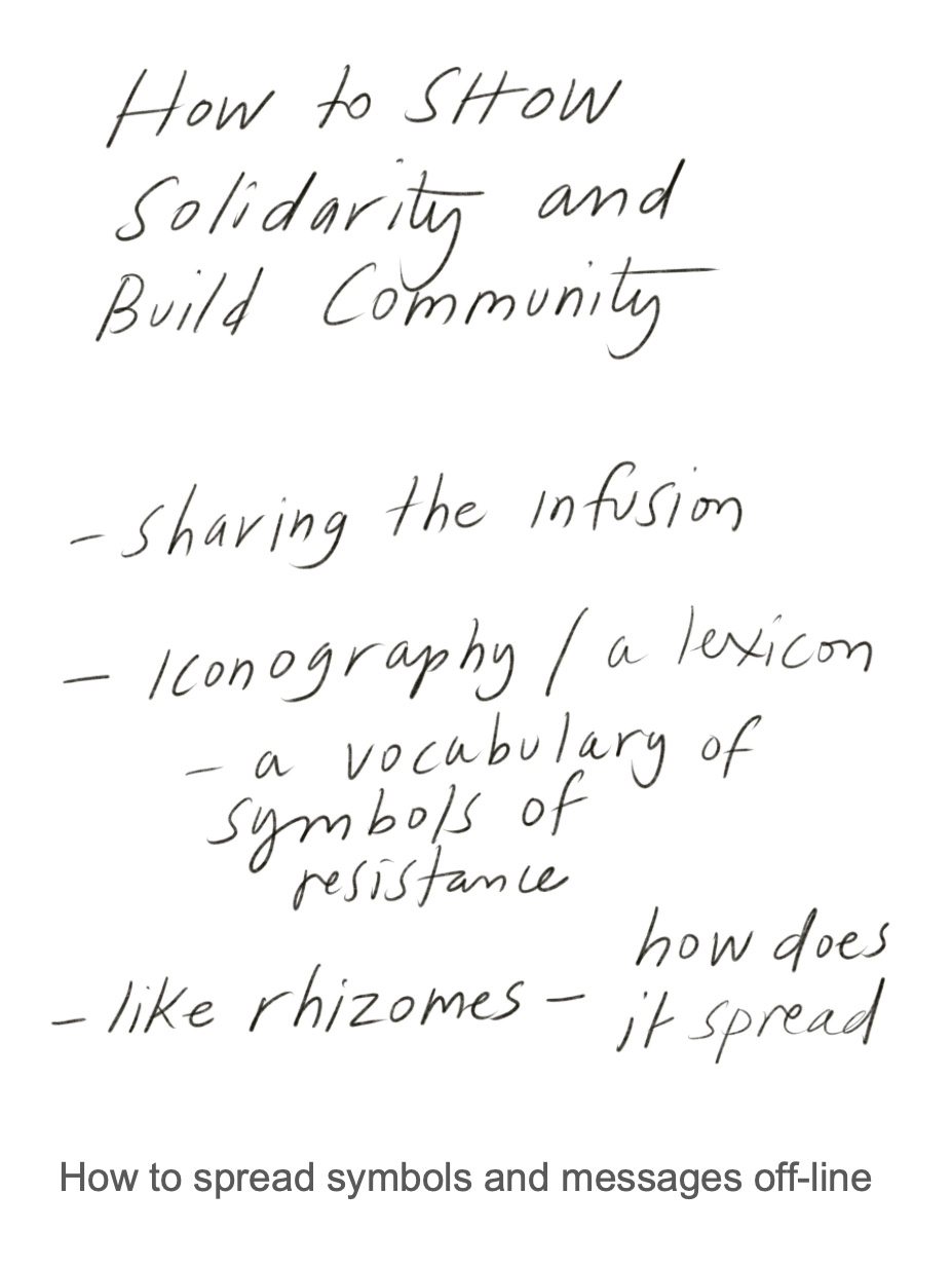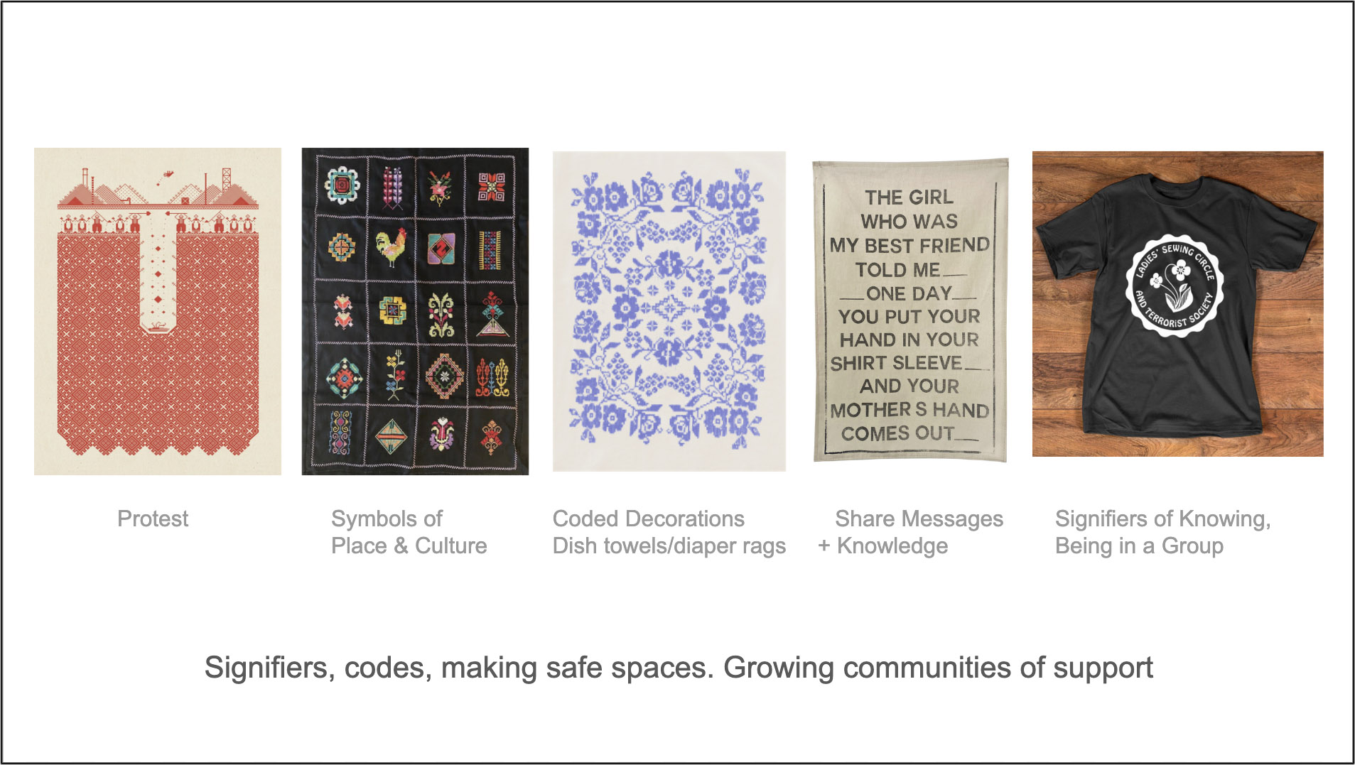 The goal was to share ideas and artists relevant to radicality and protest, new ways of being in the world, and transmitting messages through fabric, and also to make a radical textile together and talk through the possibilities of crafts, code, and building new lexicons of support and resistance. Continuing my practice of building connection through craft and embroidery, this program centered feminism, activism, sharing knowledge and imagining new worlds.