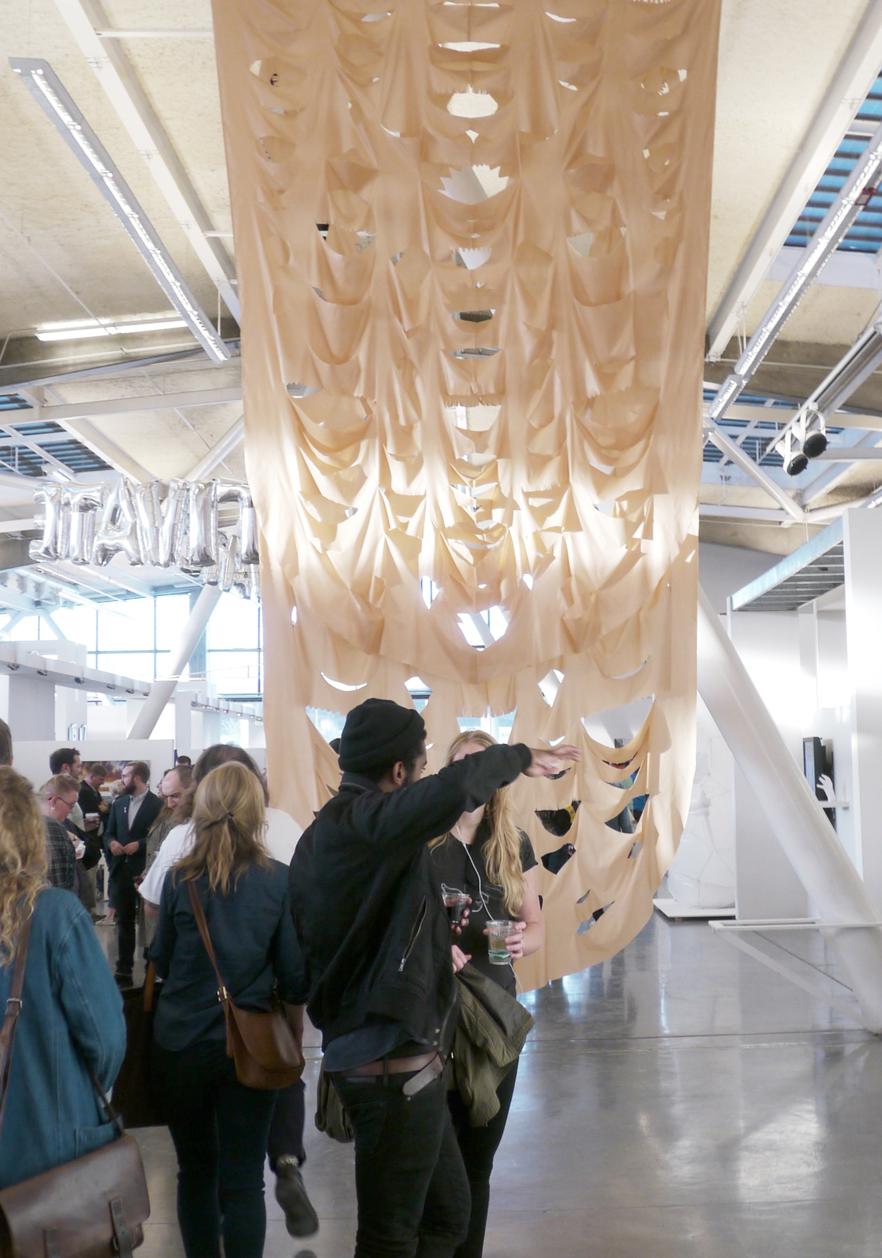 This free-hanging textile panel is based on forms deconstructed from Wycinanki Polish folk paper cutouts. Made of upcycled industrial polyester lining, it references construction tarps, and divides the space providing new perspectives.